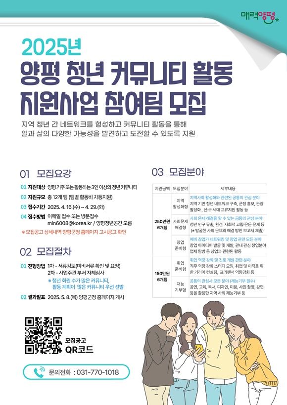¸ðÁý ´ë»óÀº ¾çÆò±º¿¡ °ÅÁÖÇϰųª Ȱµ¿ ÁßÀΠû³â 3ÀÎ ÀÌ»óÀ¸·Î ±¸¼ºµÈ Ä¿¹Â´ÏƼ·Î, ¸ðÁý ºÐ¾ß´Â ÃÑ ´Ù¼¸ °³ À¯ÇüÀÌ´Ù. ¡ãÁö¿ªÈ°¼ºÈÇü ¡ã»çȸ¹®Á¦ÇذáÇü ¡ãâ¾÷ÁغñÇü µî 3°³ ºÐ¾ß´Â °¢ 250¸¸ ¿øÀÇ º¸Á¶±ÝÀÌ Áö¿øµÇ¸ç, ¡ãÃë¾÷ÁغñÇü ¡ãÀç´É±âºÎÇüÀº °¢ 150¸¸ ¿øÀÌ Áö¿øµÈ´Ù.