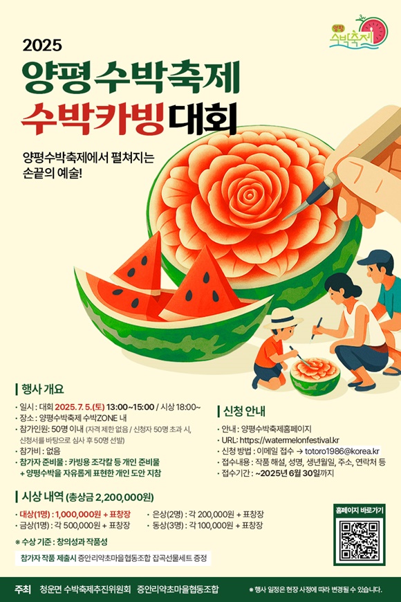 À̹ø ¼ö¹Ú Ä«ºù ´ëȸ´Â ¼ö¹ÚÀ» ´Ü¼øÈ÷ ¸Ô´Â °ÍÀ» ³Ñ¾î, ½Ã°¢ÀûÀ¸·Îµµ Áñ±æ ¼ö ÀÖ´Â ¹®È·Î È®ÀåÇϱâ À§ÇØ ¸¶·ÃµÆÀ¸¸ç, ´ë»ó ¼ö»óÀÚ¿¡°Ô´Â 100¸¸ ¿ø »ó´çÀÇ »óǰ±Ç µî ǪÁüÇÑ »óǰÀÌ Á¦°øµÉ ¿¹Á¤ÀÌ´Ù. ¸ðÁý ±â°£Àº 6¿ù 9ÀϺÎÅÍ 6¿ù 30ÀϱîÁöÀ̸ç, Áö¿øÀÚ Áß ½É»ç¸¦ ÅëÇØ ÃÑ 50ÆÀÀÌ ¼±¹ßµÉ ¿¹Á¤ÀÌ´Ù.