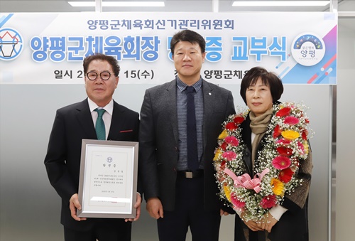 ¡ã ±è¿ëö ¾çÆò±ºÃ¼À°È¸Àå ´ç¼±ÀÚ ºÎºÎ°¡ ¸¶¼¼±Ù ¼±°üÀ§¿øÀåÀ¸·ÎºÎÅÍ ´ç¼±ÁõÀ» ±³ºÎ¹Þ°í ±â³äÃÔ¿µÀ» Çϰí ÀÖ´Ù.
