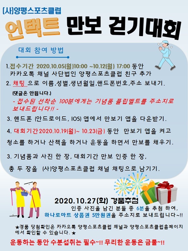 À̹ø ÇÁ·Î±×·¥Àº ¾ðÅÃÆ®(ºñ´ë¸é) ½Ã´ë¿¡ °É¸Â°Ô ¸ð¹ÙÀÏ ¾ÛÀ» ÀÌ¿ëÇØ ½Ã°£°ú Àå¼Ò¿¡ ±¸¾Ö¹ÞÁö ¾Ê°í ´©±¸³ª ÀÏ»ó»ýȰ¿¡¼­ °È±â ¿îµ¿À» ½ÇõÇÒ ¼ö ÀÖ°Ô ±¸¼ºµÅ ¿À´Â 19ÀϺÎÅÍ 23ÀϱîÁö ÀÚ½ÅÀÌ ¿øÇÏ´Â ½Ã°£°ú Àå¼Ò¿¡¼­ ¸¸º¸¸¦ °È°í, ¸¸º¸±â ¾ÛÀ» ÅëÇØ º»ÀÎÀÇ °ÉÀ½ ¼ö¸¦ ÃøÁ¤ÇÏ´Â ¹æ½Ä¿ì·Î ÁøÇàµÈ´Ù.