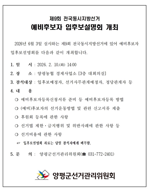 ¾çÆò±º¼±°Å°ü¸®À§¿øÈ¸´Â ¿À´Â 2¿ù 10ÀÏ(È) ¿ÀÈÄ 2½Ã, ¾çÆò³óÇù °æÁ¦»ç¾÷¼Ò 3Ãþ ´ëȸÀǽǿ¡¼ 2026³â 6¿ù 3ÀÏ ½Ç½Ã ¿¹Á¤ÀÎ Á¦9ȸ Àü±¹µ¿½ÃÁö¹æ¼±°Å¿Í °ü·ÃÇØ ¡®¿¹ºñÈĺ¸ÀÚ ÀÔÈĺ¸¼³¸íȸ¡¯¸¦ °³ÃÖÇÑ´Ù°í ¹àÇû´Ù.