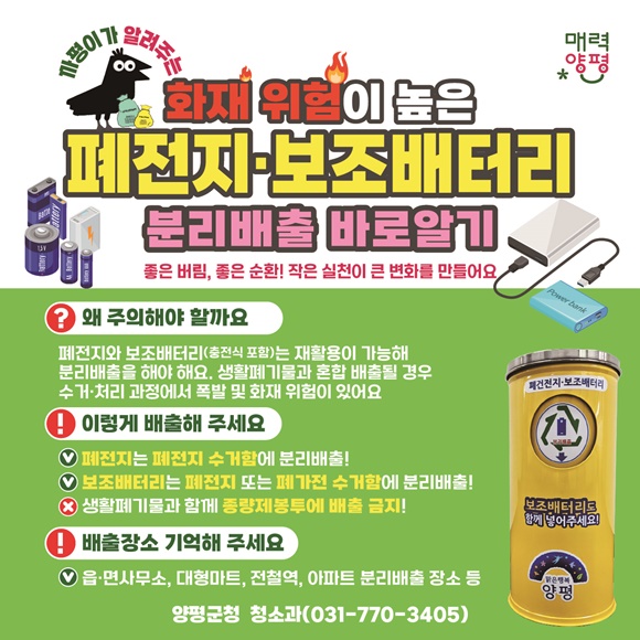 ÀüÁø¼± ¾çÆò±º¼ö´Â ¡°º¸Á¶¹èÅ͸®³ª ÃæÀü¿ë ÀüÁö´Â Å©±â°¡ ÀÛ¾Æ ¹«½ÉÄÚ ÀϹݾ²·¹±â·Î ¹ö¸®±â ½±Áö¸¸, ÀÛÀº ºÎÁÖÀǰ¡ Å« ÈÀç »ç°í·Î À̾îÁú ¼ö ÀÖ´Ù¡±¸ç ¡°±º¹Î ¿©·¯ºÐÀÇ ¿Ã¹Ù¸¥ ºÐ¸®¹èÃâ ½ÇõÀÌ È¯°æÀ» Áö۰í, ÀÛ¾÷ÀÚ¿Í Áö¿ª»çȸÀÇ ¾ÈÀüÀ» ÁöŰ´Â °¡Àå ½±°í È®½ÇÇÑ ¹æ¹ý¡±À̶ó°í °Á¶Çß´Ù.
