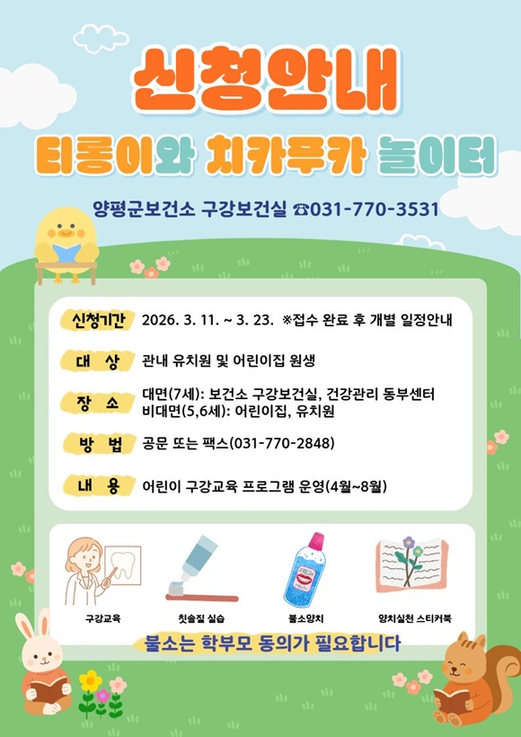 ¾çÆò±º(±º¼ö ÀüÁø¼±)Àº ¾î¸°ÀÌÁý°ú À¯Ä¡¿ø ¾Æµ¿À» ´ë»óÀ¸·Î ¿Ã¹Ù¸¥ ±¸°°ü¸® ½À°ü Çü¼º°ú ±¸°°Ç° ÁõÁøÀ» À§ÇÑ ¡®Æ¼·ÕÀÌ¿Í Ä¡Ä«ÇªÄ« ³îÀÌÅÍ¡¯ ÇÁ·Î±×·¥À» ¿À´Â 4¿ùºÎÅÍ 8¿ù±îÁö ¿î¿µÇÑ´Ù°í ¹àÇû´Ù.