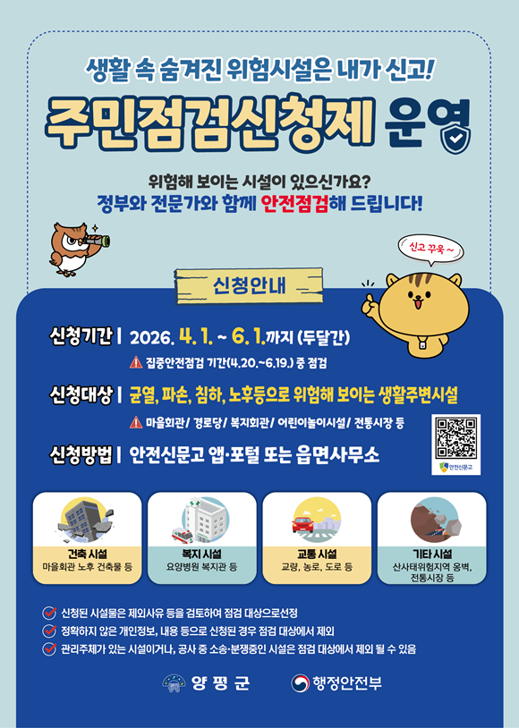 ±ºÀº 4¿ù 1ÀϺÎÅÍ 6¿ù 1ÀϱîÁö ¡®2026³â ÁýÁß¾ÈÀüÁ¡°Ë ÁÖ¹ÎÁ¡°Ë½ÅûÁ¦¡¯¸¦ ¿î¿µÇÑ´Ù°í ¹àÇû´Ù. ÀÌ Á¦µµ´Â Àç³­À̳ª ¾ÈÀü»ç°í°¡ ¿ì·ÁµÇ´Â ½Ã¼³À» ±º¹ÎÀÌ Á÷Á¢ ½ÅûÇϸé Àü¹®°¡¿Í °ø¹«¿øÀÌ ÇÔ²² Á¡°Ë¿¡ ³ª¼­´Â ¹æ½ÄÀ¸·Î, º¸´Ù ÃÎÃÎÇÑ Áö¿ª ¾ÈÀü¸Á ±¸ÃàÀ» ¸ñÇ¥·Î ÇÑ´Ù.