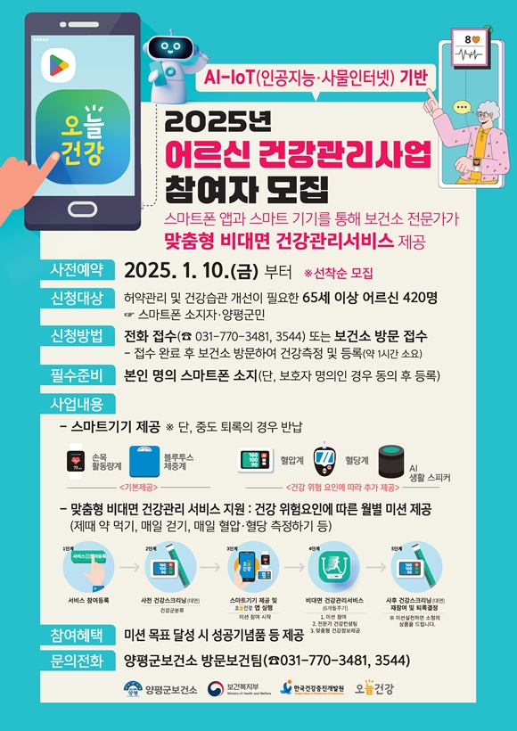 À̹ø ¡°AI¡¤IoT±â¹Ý ¾î¸£½Å °Ç°­°ü¸® »ç¾÷¡±Àº Äڷγª19 ÀÌÈÄ °Ç°­ÁõÁø ¼­ºñ½ºÀÇ Á¢±Ù¼ºÀÌ ¶³¾îÁö´Â ¾î¸£½ÅÀ» ´ë»óÀ¸·Î Áö¼Ó °¡´ÉÇÑ ºñ´ë¸é°Ç°­°ü¸® ¼­ºñ½º ü°è¸¦ ±¸ÃàÇϰíÀÚ ½ÃÀÛµÈ »ç¾÷ÀÌ´Ù. ¾çÆò±ºÀº 2022³â 10¿ù º¸°Çº¹ÁöºÎ ÁÖ°ü°ø¸ð»ç¾÷¿¡ ¼±Á¤µÊ¿¡ µû¶ó 2023³â 7¿ùºÎÅÍ »ç¾÷À» ½ÃÀÛÇß´Ù. 2024³â¿¡´Â AI ·Îº¿À» Ȱ¿ëÇÑ °Ç°­°ü¸®±îÁö ´õÇØ°Ç°­°ü¸®»ç¾÷À» Àû±Ø ÃßÁøÇß´Ù.