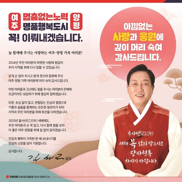 ±¹¹ÎÀÇÈû ±è¼±±³(64) ±¹È¸ÀÇ¿øÀÌ 2024³â ÀÇÁ¤È°µ¿À» ´ãÀº ÀÇÁ¤º¸°í¼¸¦ ¹ß°£ÇØ ¿©ÁÖ½Ã¿Í ¾çÆò±º Áֹε鿡°Ô º¸°íÇß´Ù.