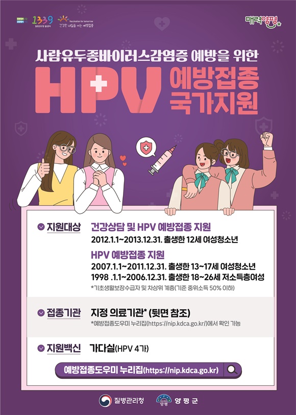 ¿¹¹æÁ¢Á¾Àº ¾çÆò±º¿¡¼ ÁöÁ¤ÇÑ ÀÇ·á±â°ü 11°³¼Ò¿¡¼ ¹ÞÀ» ¼ö ÀÖÀ¸¸ç, ÁöÁ¤ ÀÇ·á±â°üÀº ¿¹¹æÁ¢Á¾µµ¿ì¹Ì ´©¸®Áý¿¡¼ È®ÀÎÇÒ ¼ö ÀÖ´Ù. ´ë»óÀÚ´Â ½ÅºÐÁõÀ» ÁöÂüÇϰí ÀÇ·á±â°üÀ» ¹æ¹®ÇØ¾ß Çϸç Àú¼ÒµæÃþÀÇ °æ¿ì ÀÚ°Ý È®ÀÎ ¼·ù°¡ ÇÊ¿äÇÏ´Ù.