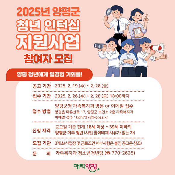 ¾çÆò±º(±º¼ö ÀüÁø¼±)Àº ¡®Ã»³â ÀÎÅÏ½Ê Áö¿ø »ç¾÷¡¯¿¡ ´ëÇÑ Âü¿©ÀÚ ¸ðÁý Á¢¼ö¸¦ ½Ç½ÃÇÑ´Ù°í 19ÀÏ ¹àÇû´Ù. À̹ø »ç¾÷Àº ¾çÆò±º ³» ÀηÂÀÌ ÇÊ¿äÇÑ »ç¾÷Àå°ú °ü³» °ÅÁÖ ¹ÌÃë¾÷ û³âÀ» ¿¬°èÇÏ°í »ç¾÷Àå¿¡ ÀΰǺñ¸¦ Áö¿øÇÏ´Â »ç¾÷À¸·Î, Á¢¼ö ±â°£Àº 2¿ù 26ÀϺÎÅÍ 28ÀϱîÁöÀÌ´Ù.