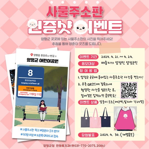 À̹ø Çà»ç´Â ¾çÆò±º¹Î ´©±¸³ª Âü¿©ÇÒ ¼ö ÀÖÀ¸¸ç, ÀÀ¸ð¹æ¹ýÀº ¾çÆò±º °÷°÷¿¡ ¼³Ä¡µÈ »ç¹°ÁÖ¼ÒÆÇÀ» ã¾Æ Á÷Á¢ »çÁøÀ» ÃÔ¿µÇÑ µÚ, À̺¥Æ® ¾È³»Áö¿¡ Æ÷ÇÔµÈ Á¤º¸ ¹«´Ì(QR ÄÚµå)¸¦ ÅëÇØ »çÁøÀ» °Ô½ÃÇÏ¸é µÈ´Ù. À̺¥Æ®¿¡ Âü¿©ÇÑ ±º¹Î Áß ÃÑ 50¸íÀ» ÃßÃ·ÇØ ¾çÆò±º ij¸¯ÅÍ ¡®¾çÃáÀÌ¡¯°¡ ±×·ÁÁø ģȯ°æ °¡¹æ ¶Ç´Â ¾ÕÄ¡¸¶¸¦ °æÇ°À¸·Î ÁõÁ¤ÇÒ ¿¹Á¤ÀÌ´Ù.