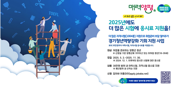 ´ë»óÀÚ´Â °æ±âµµÀÏÀÚ¸®Àç´Ü ÅëÇÕÁ¢¼ö½Ã½ºÅÛ ¡®Àâ¾Æ¹Ù ¾îÇöóÀÌ¡¯¸¦ ÅëÇØ ¿Â¶óÀÎÀ¸·Î ½Åû °¡´ÉÇϸç, ½Åû ±â°£Àº 5¿ù 2ÀϺÎÅÍ 11¿ù 30ÀϱîÁöÀÌ´Ù. 2024³â 12¿ùºÎÅÍ 2025³â 11¿ù±îÁö ÀÀ½ÃÇÑ ½ÃÇè ³»¿ª¿¡ ÇÑÇÏ¿© Áö¿øµÇ¸ç Áö¿ø±ÝÀº 2025³â 5¿ùºÎÅÍ 12¿ù±îÁö ¼·ù º¸¿Ï ¹× °ËÁõÀ» °ÅÃÄ ¼øÂ÷ÀûÀ¸·Î Áö±ÞµÉ ¿¹Á¤ÀÌ´Ù.