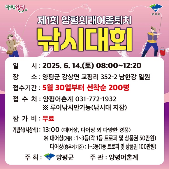 ¾çÆò±º(±º¼ö ÀüÁø¼±)Àº ³²ÇѰ »ýÅÂ°è ±³¶õ À¯ÇØ ¿Ü·¡ ¾îÁ¾ È®»ê¿¡ µû¸¥ Åä»ê¾îÁ¾ º¸È£¸¦ À§ÇØ Á¦1ȸ ¾çÆò ¡®¿Ü·¡ ¾îÁ¾ ÅðÄ¡ ³¬½Ã ´ëȸ¡¯¸¦ 6¿ù 14ÀÏ °³ÃÖÇÑ´Ù°í ¹àÇû´Ù. À̹ø Çà»ç´Â ±º¹Î°ú ¿ÜÁö ³¬½Ã°´ÀÌ ÇÔ²² Âü¿©ÇØ ¿Ü·¡ ¾îÁ¾ ÅðÄ¡´Â ¹°·Ð Áö¿ª È«º¸¿Í °æÁ¦ Ȱ¼ºÈ¿¡µµ ±â¿©ÇÒ °ÍÀ¸·Î ±â´ëµÈ´Ù.