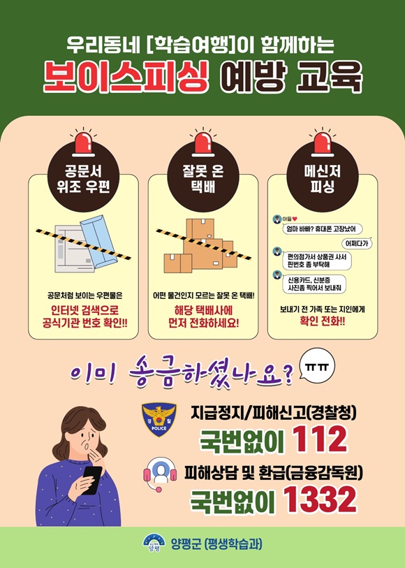 ÃÖ±Ù °¡Á·À̳ª Á¤ºÎ±â°üÀ» »çĪÇϰųª ¹®ÀÚ ¸µÅ©¸¦ ÅëÇØ °³ÀÎÁ¤º¸¿Í ±ÝÀüÀ» Å»ÃëÇÏ´Â µî °í·ÉÃþÀ» °Ü³ÉÇÑ º¸À̽ºÇÇ½Ì ¼ö¹ýÀÌ Á¡Á¡ Á¤±³ÇØÁö°í ÀÖ´Â °¡¿îµ¥, À̹ø ±³À°Àº ½Ç»ýȰ ÇÇÇØ »ç·Ê¸¦ Áß½ÉÀ¸·Î ±¸¼ºµÅ ¾î¸£½ÅµéÀÇ ÀÌÇØµµ¿Í ´ëÀÀ·ÂÀ» ³ôÀÌ´Â µ¥ ÁßÁ¡À» µ×´Ù. ƯÈ÷ ½¬¿î ¿ë¾î¿Í ¹Ýº¹ ¼³¸íÀ» ÅëÇØ ¾î¸£½Å ´«³ôÀÌ¿¡ ¸ÂÃá ¼³¸íÀÌ ÀÌ·ç¾îÁ³´Ù´Â Á¡¿¡¼­ ½ÇÈ¿¼ºÀÌ ³ô¾Ò´Ù´Â Æò°¡´Ù.