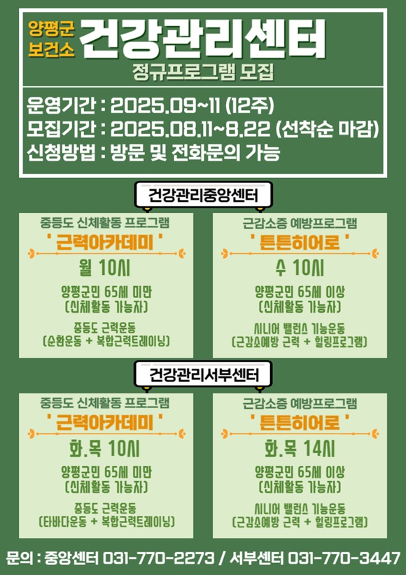 ¾çÆò±ºº¸°Ç¼Ò °Ç°­°ü¸®¼¾ÅÍ´Â ¿À´Â 8¿ù 11ÀϺÎÅÍ 22ÀϱîÁö ÇϹݱâ Á¤±Ô ½ÅüȰµ¿ ÇÁ·Î±×·¥ Âü¿© ´ë»óÀÚ¸¦ ¸ðÁýÇÑ´Ù°í ¹àÇû´Ù. À̹ø ÇÁ·Î±×·¥Àº °Ç°­ ¼öÁØ¿¡ µû¸¥ ¸ÂÃ㠿°ú Àü¹® »ó´ãÀ» ÅëÇØ ¸¸¼ºÁúȯ ¿¹¹æ ¹× ü·Â ÁõÁøÀ» µµ¸ðÇϰíÀÚ ¸¶·ÃµÆ´Ù.