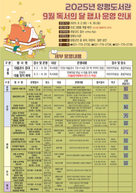 ¾çÆò±º(±º¼ö ÀüÁø¼±)Àº 9¿ù µ¶¼ÀÇ ´ÞÀ» ¸Â¾Æ ÁֹεéÀÇ µ¶¼ ¹®È¸¦ »ýȰ ¼Ó¿¡ È®»êÇϰí, Ã¥°úÀÇ °Å¸®¸¦ Á¼È÷±â À§ÇÑ ´Ù¾çÇÑ Çà»ç¸¦ 9¿ù 2ÀϺÎÅÍ 9¿ù 30ÀϱîÁö ¿î¿µÇÑ´Ù°í ¹àÇû´Ù. À̹ø Çà»ç´Â ¾î¸°À̺ÎÅÍ ¼ºÀαîÁö ¸ðµç ¿¬·ÉÃþÀÌ Áñ±æ ¼ö ÀÖ´Â ÃÑ 11Á¾ÀÇ ÇÁ·Î±×·¥À¸·Î ±¸¼ºµÆ´Ù.