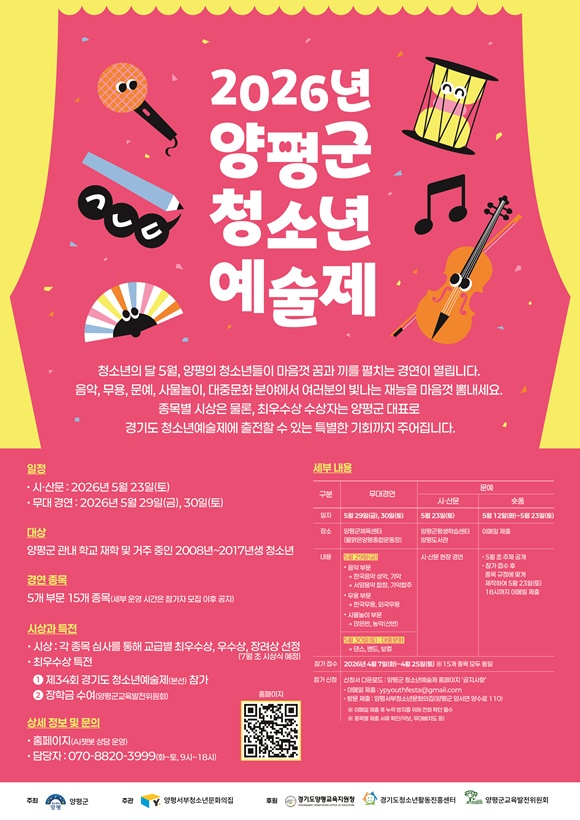 ¾çÆòÀÇ º½À» û¼Ò³âµéÀÇ ¿Á¤°ú ¿¹¼ú·Î ¹°µéÀÏ ¹«´ë°¡ ¿¸°´Ù. ¾çÆò±ºÀÌ ÁÖÃÖÇÏ°í ¾çÆò¼ºÎû¼Ò³â¹®ÈÀÇÁýÀÌ ÁÖ°üÇÏ´Â ¡®2026³â ¾çÆò±º û¼Ò³â¿¹¼úÁ¦¡¯°¡ ¿À´Â 5¿ù °³ÃÖ¸¦ ¾ÕµÎ°í 4¿ù 7ÀϺÎÅÍ 25ÀϱîÁö Âü°¡ÀÚ¸¦ ¸ðÁýÇÑ´Ù.